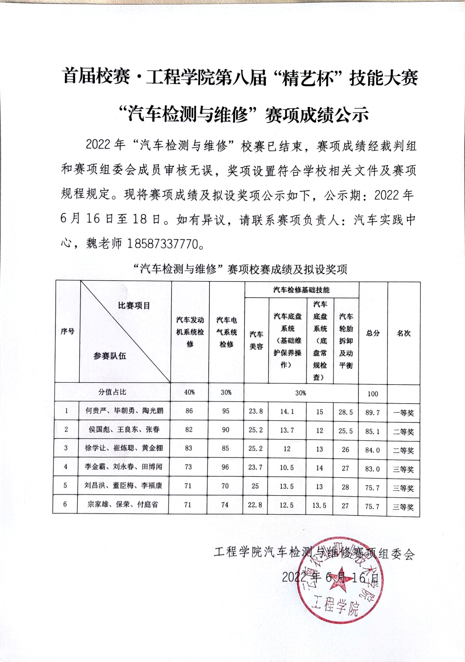首届校赛 · 工程学院第八届“精艺杯”技能大赛“汽车检测与维修”赛项成绩公示