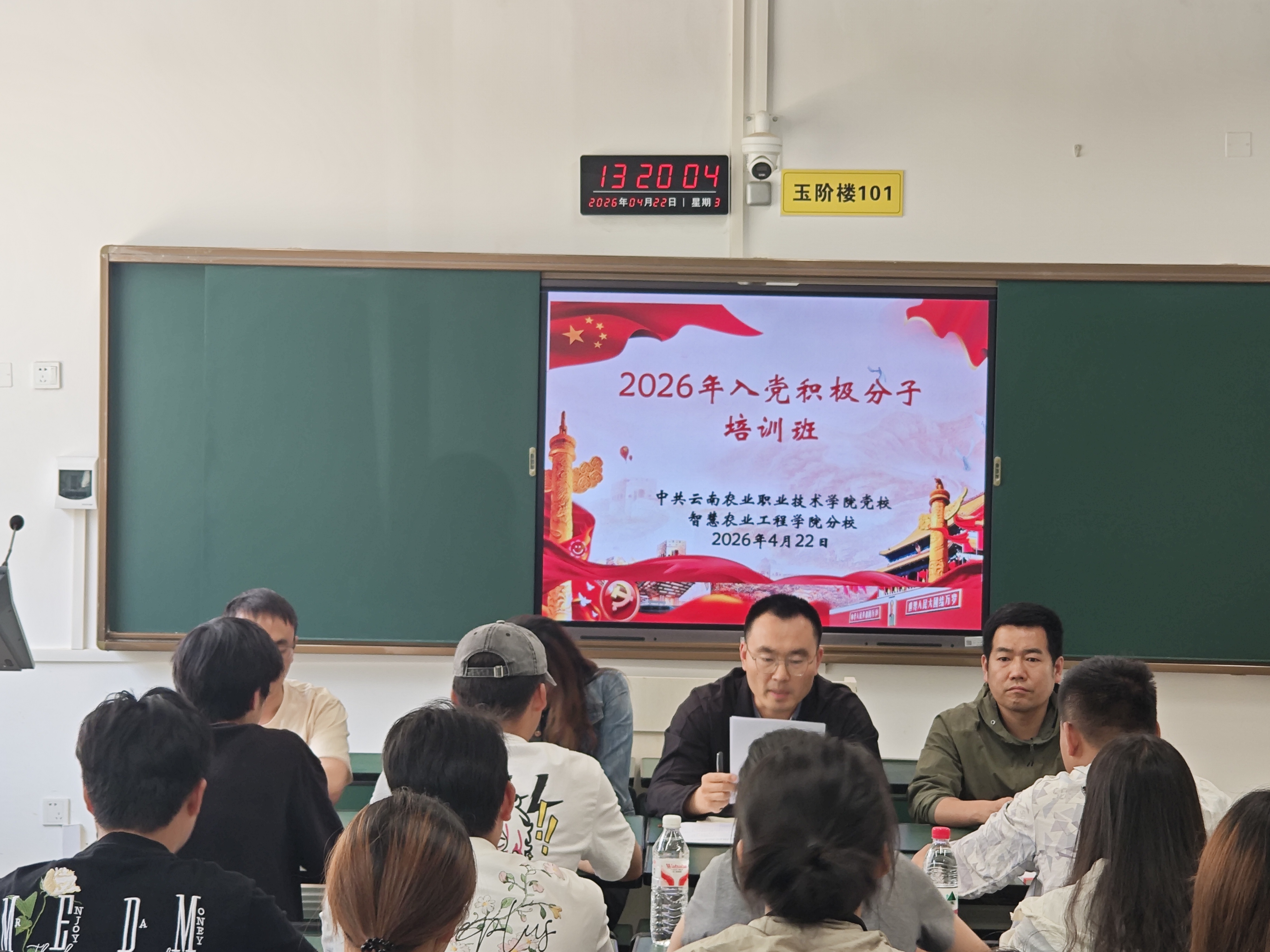 为强化入党积极分子思想淬炼与理论素养,夯实学院党员发展工作根基,4月22日下午,智慧农业工程学院2026年入党积极分子培训开班会议在玉阶楼101教室顺利举行。学院党总支书记陈智平,学生支部书记向亭译,教工支部书记丁磊,学生支部组织委员朱律,专职组织员杨玥,培训班班主任阚世朋及全体入党积极分子参加会议。会议由学院党总支书记陈智平主持。